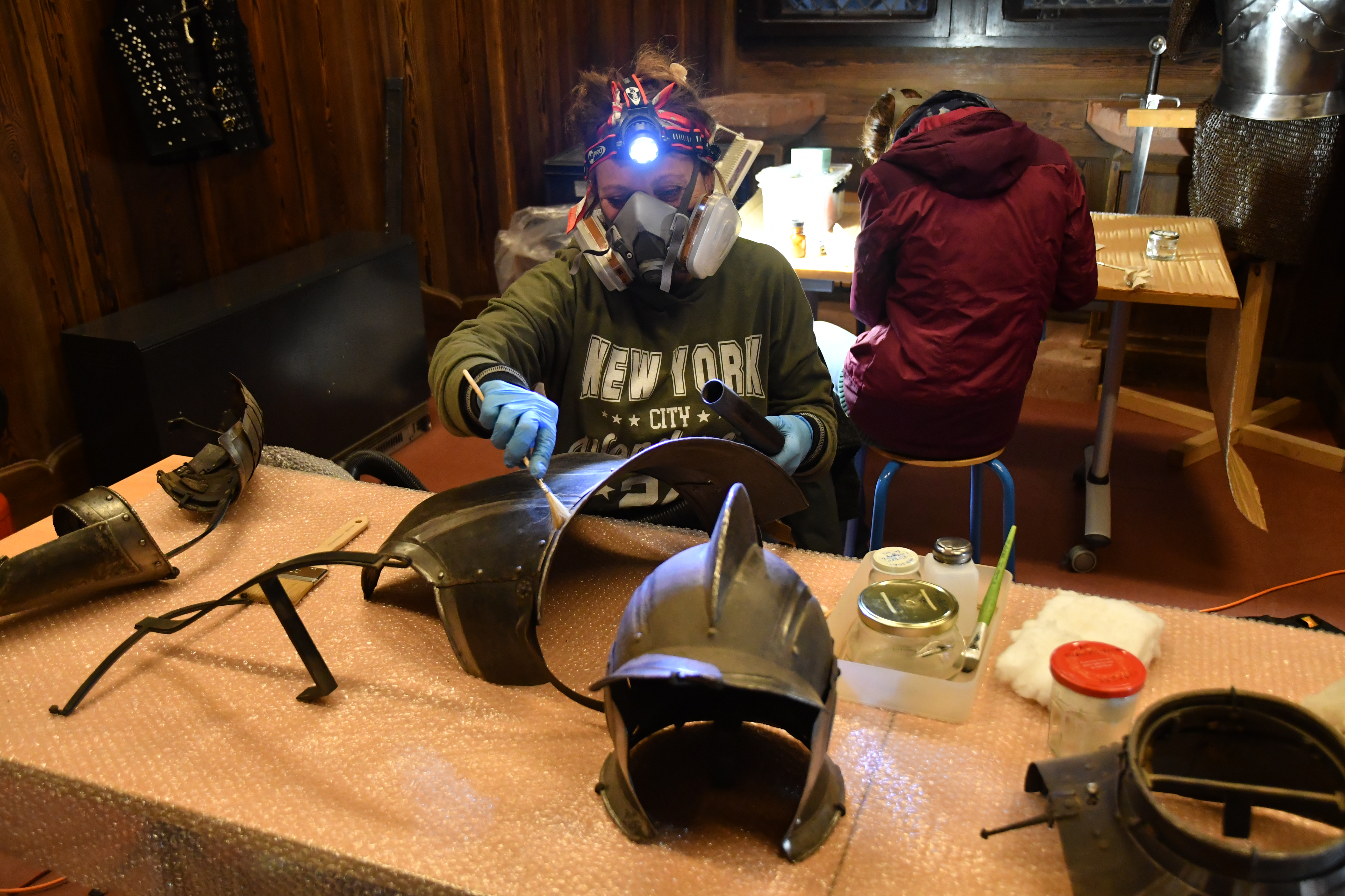 For five days, the six prestigious armour suits, restored and returned to theKaiser hall at the end of November 2022, were dismantled, dusted (using vacuum cleaners and brushes), waxed, polished and meticulously examined so that they could be reassembled on their respective brackets and admired in all their splendour under the supervision of two restorers (Anne-Catherine Goetz for the leather and Bluenn Boulangé for the metal) and four Haut-Koenigsbourg castle staff members trained in conservation.