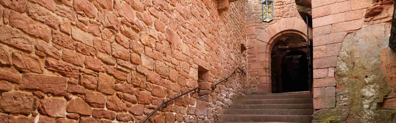 The entrance to the high castle is via a staircase overlooked by a covered walkway.