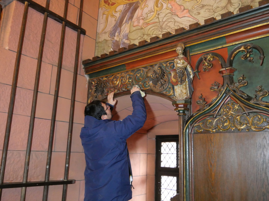 Entretien et nettoyage des six armures de la salle du Kaiser au château du Haut-Koenigsbourg en novembre 2025.